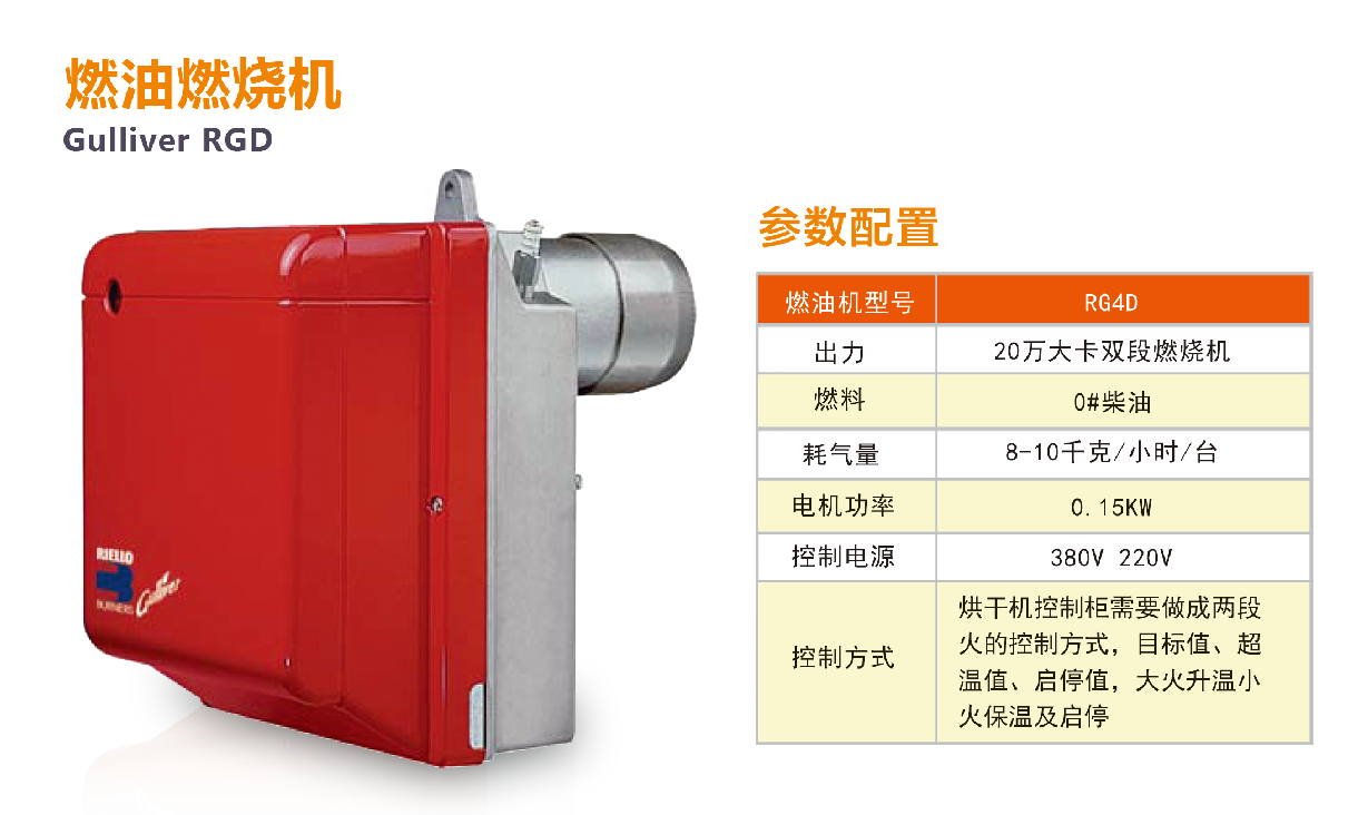 我公司配置的Gulliver RGD两段火轻油燃烧器产品是专为满足各种供暖、供热需求而研发的,出力范围为14KW-296KW,两段火运行保证了燃烧器高效性能,所有产品均使用由利雅路公司专为Gulliver系列设计的相同零部件,高品质的制造标准保证了燃烧器的安全工作。