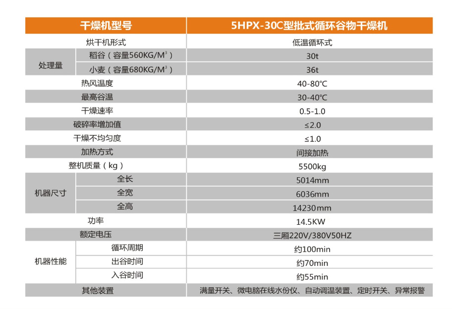 我公司最新研发的5HPX-30C型低温批式循环谷物干燥机采用了全新的设计理念,取消了上下绞龙装置,采用流管式进粮出粮,减少了谷物干燥过程中的破碎率,同时减少了设备的故障率,简化了运行原理,加快了干燥速度,扩大了装载容量, 改进了烘干结构, 适用于稻谷、小麦、玉米、高粱及各类谷物种子的干燥。